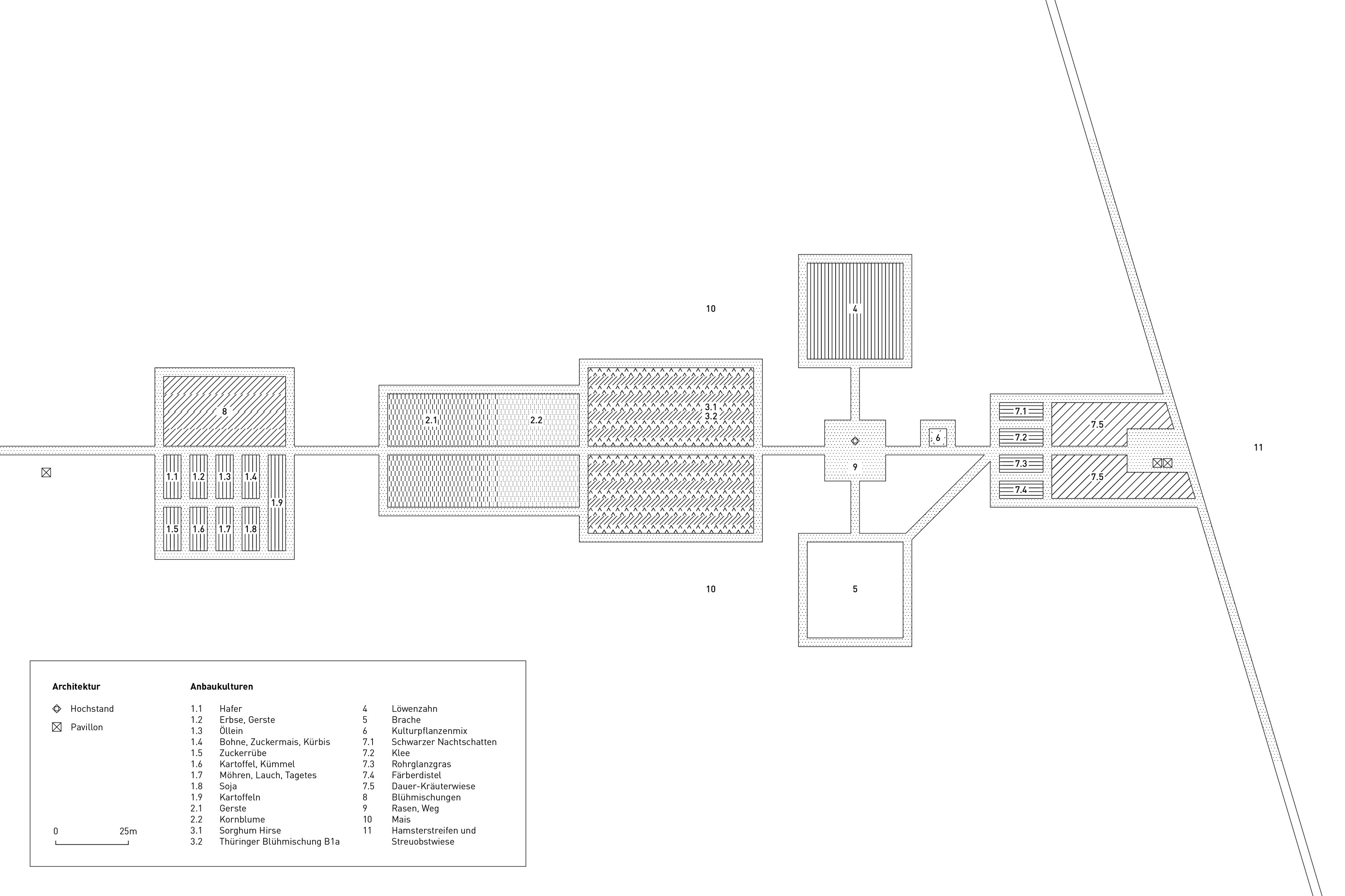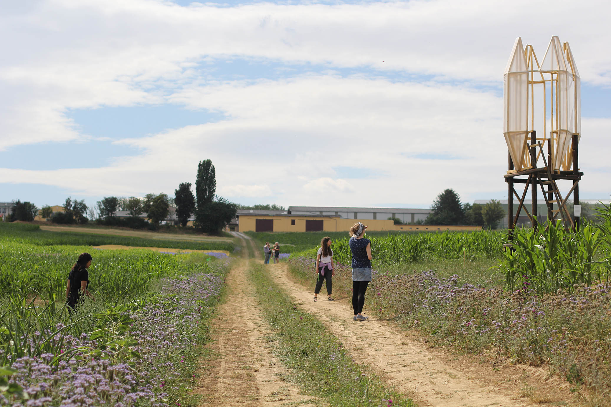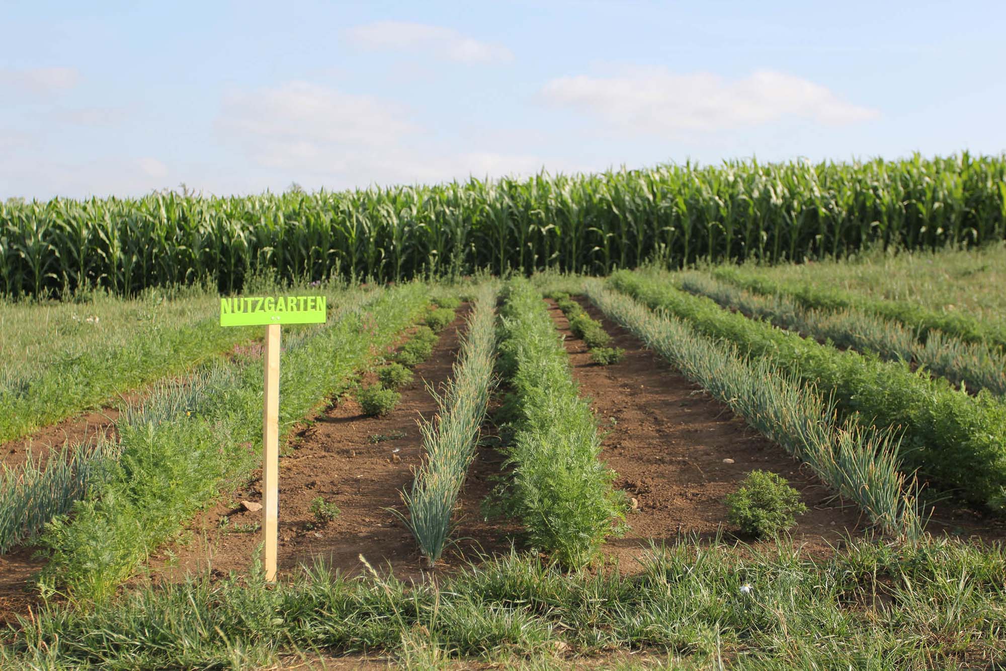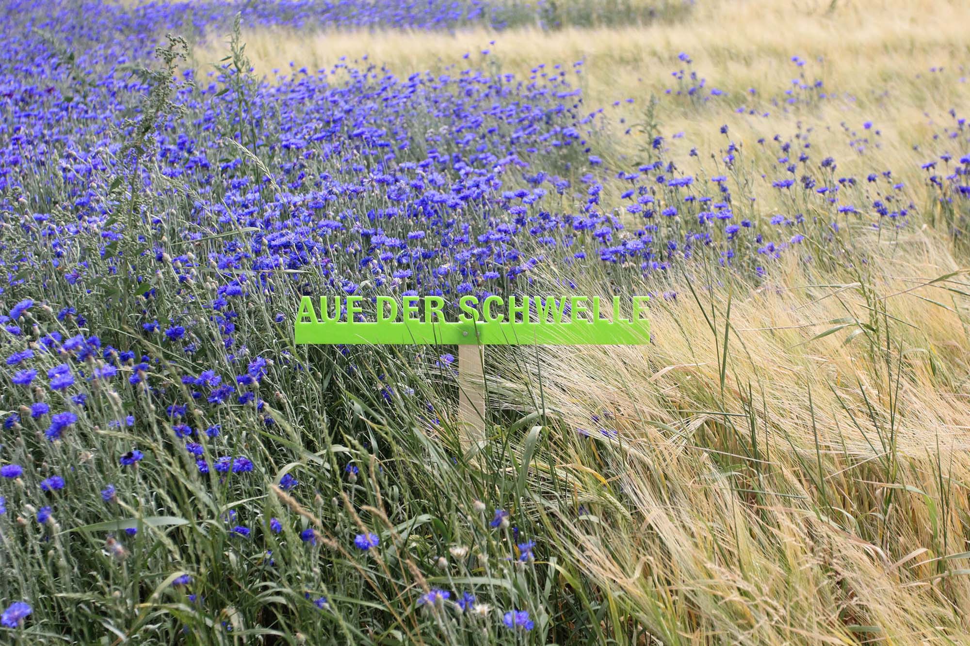 Auf dem Feld gab es verschiedene Parzellen (siehe Anbauplan), jeweils durch Beschilderung markiert. Es begann mit Beeten, die an Nutzgärten erinnern sollten, in denen verschiedene traditionelle wie auch neuere Anbaukulturen in Rein- sowie in Mischkultur zu sehen waren. Durch die Aussaat eines Zierkornblumenfeldes, dass graduell in ein Getreidefeld mündete, adressierten wir den Widerspruch zwischen Wildnis und geordneten Pflanzungen.