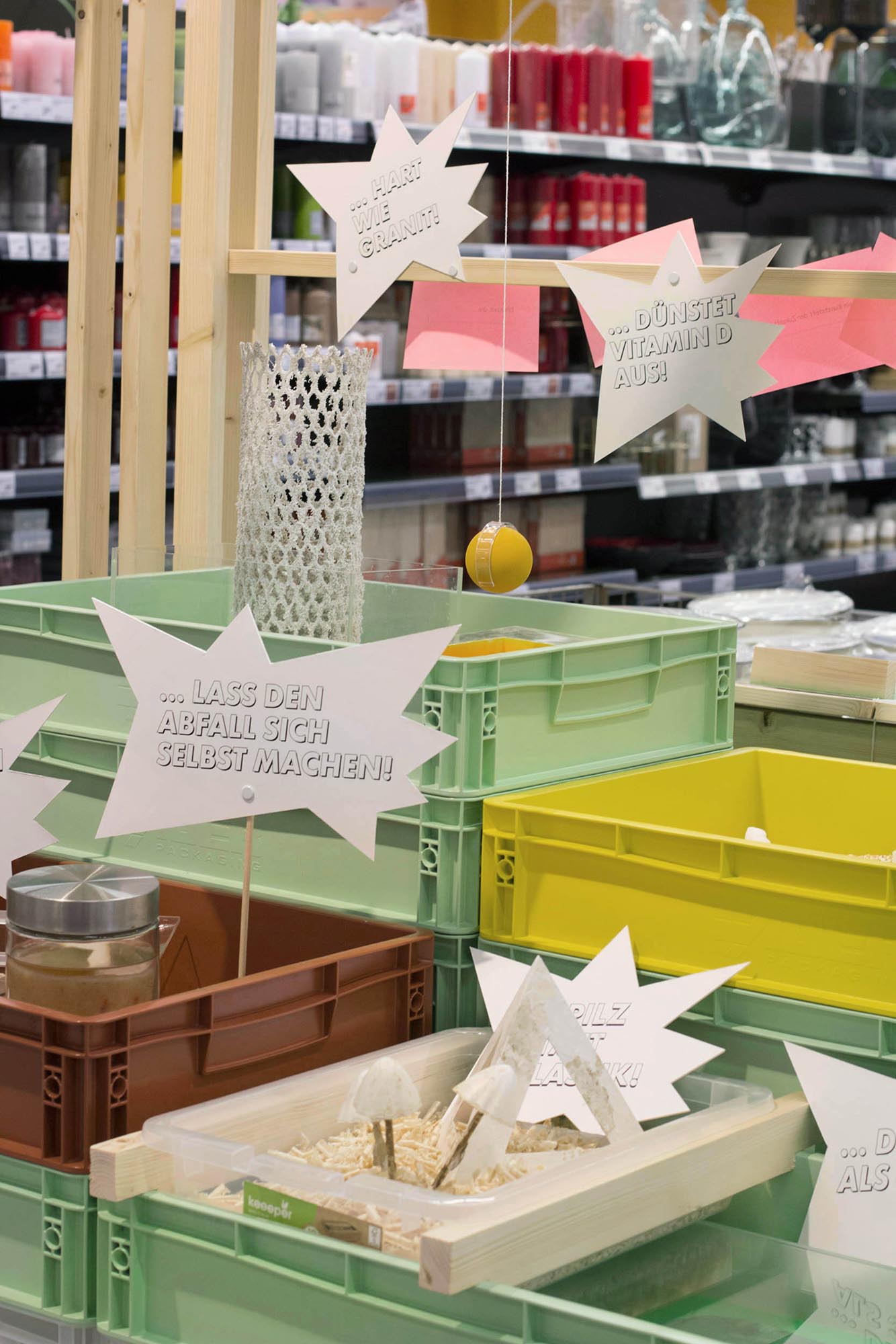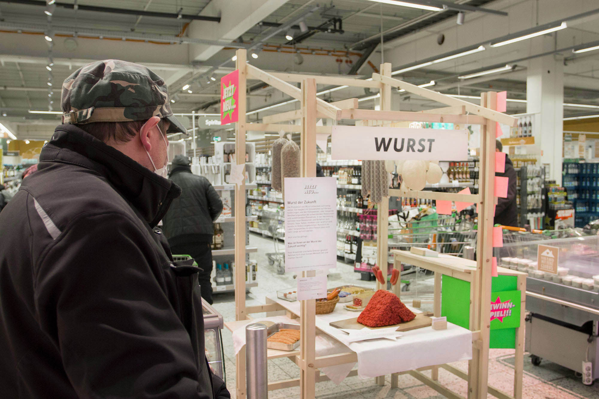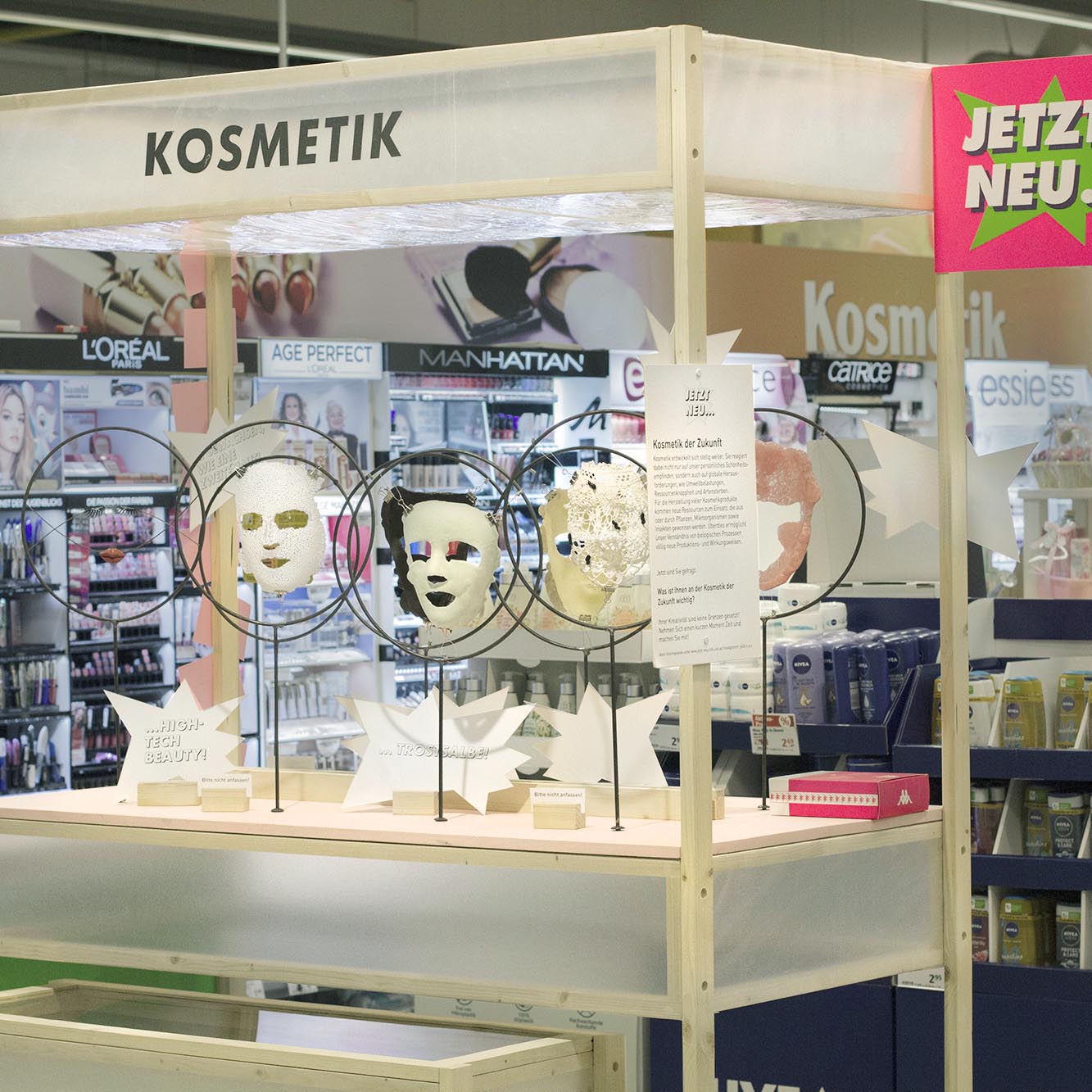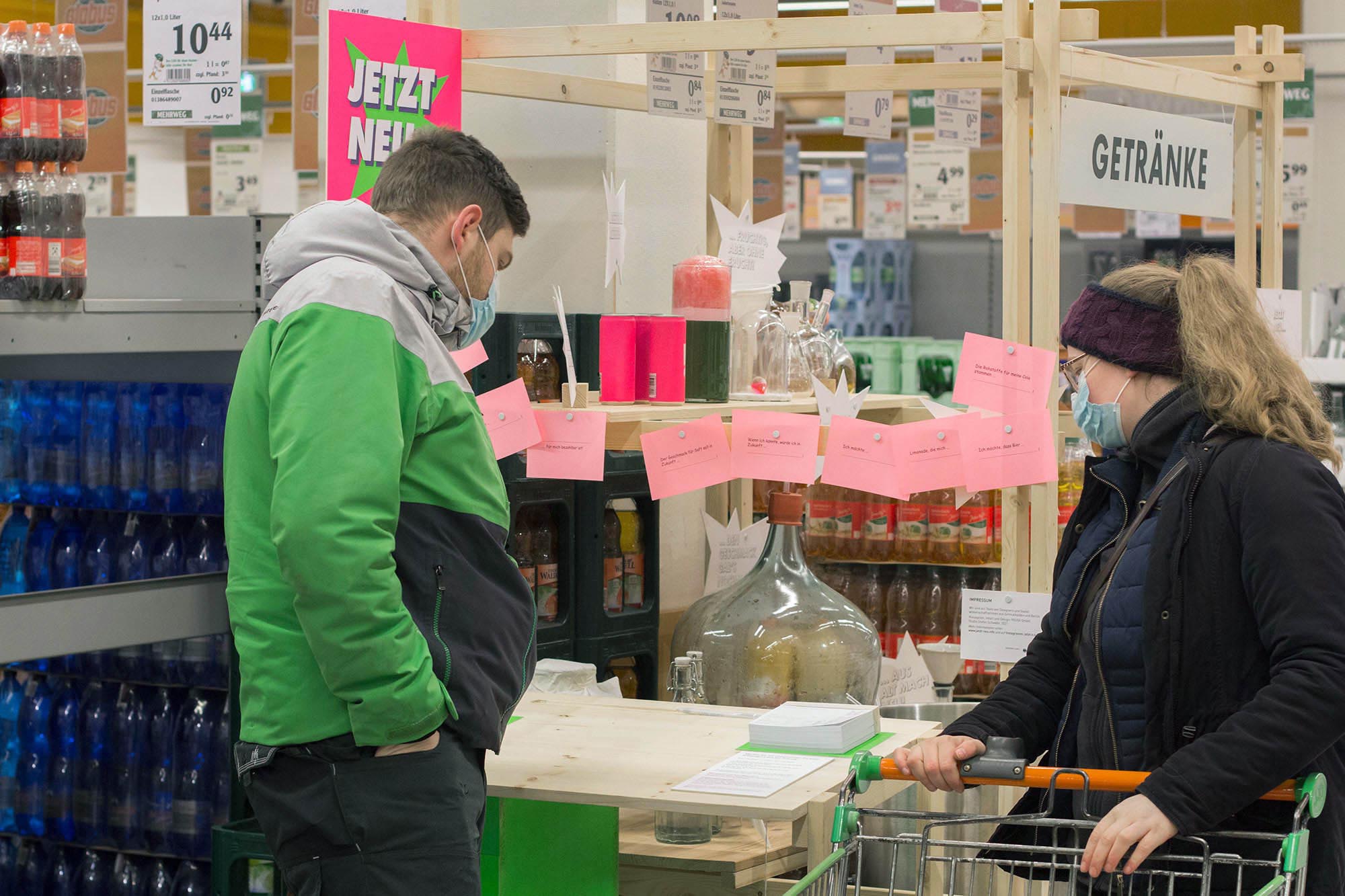 Mit Jetzt Neu… hatten wir die großartige Chance temporär vier Erfahrungsräume mit spekulativen Produkten als Intervention in einem Supermarkt aufzubauen. Der Fokus des Forschungsprojektes lag darauf, experimentell zu erproben, wie man Menschen in ihrer Lebenswelt erreichen und begeistern kann, gemeinsam über Ideen und Wünsche für die Zukunft nachzudenken.