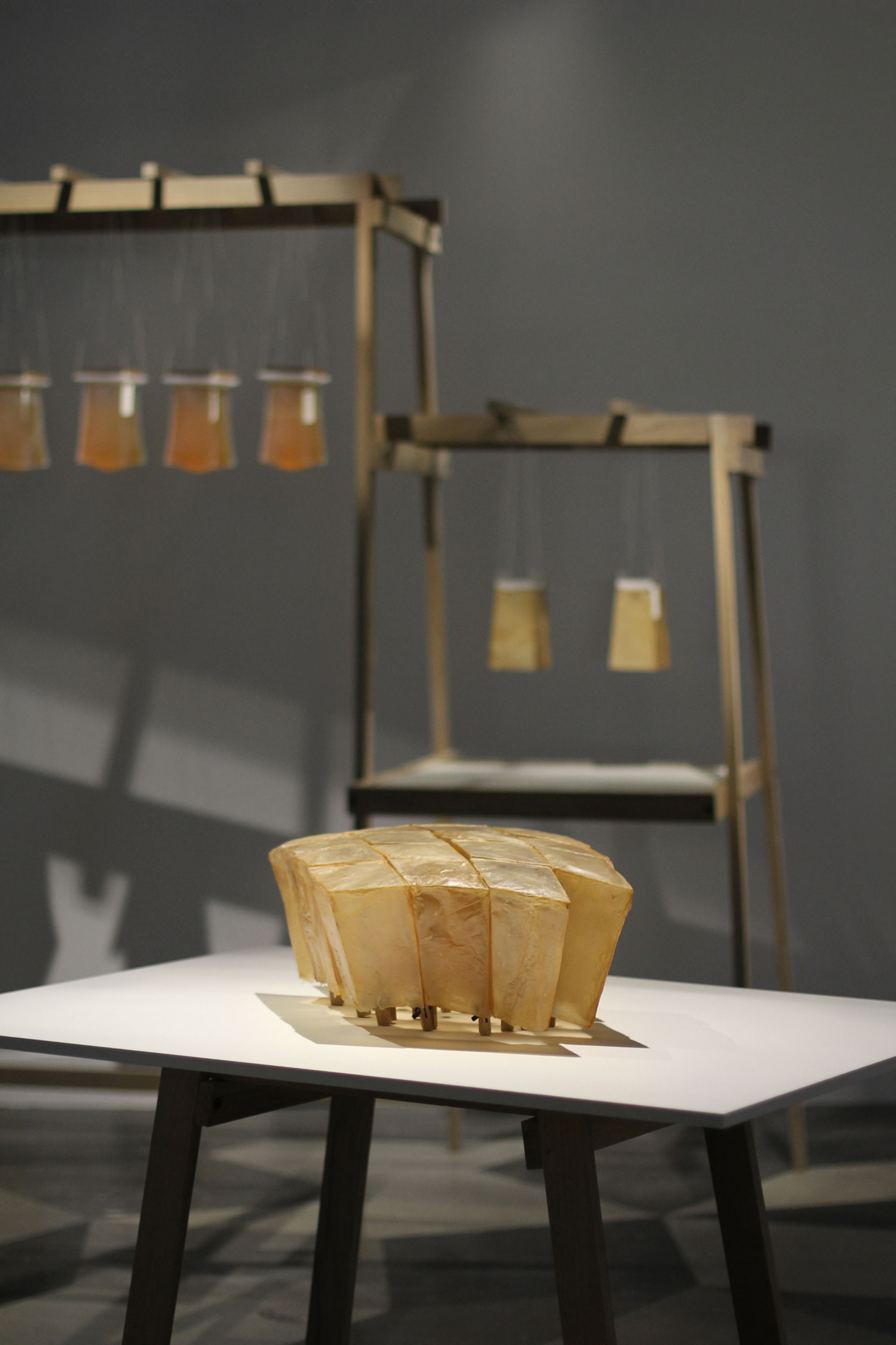Within a growth period of three weeks each cellulose cone is ripening in a suspended mould. Hereafter it is dried and added to a sculptural assembly. The shape of the single cones as well as the way they are assembled is inspired by natural patterns of regularity, such as reptile scales or flower seeds. Similar but not the same, each single part is following a defined system.